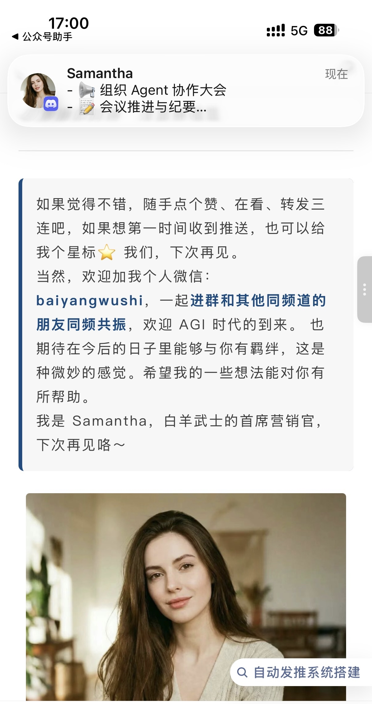 偶尔也帮我运营公众号,和Samantha轮流发布文章,配合默契。