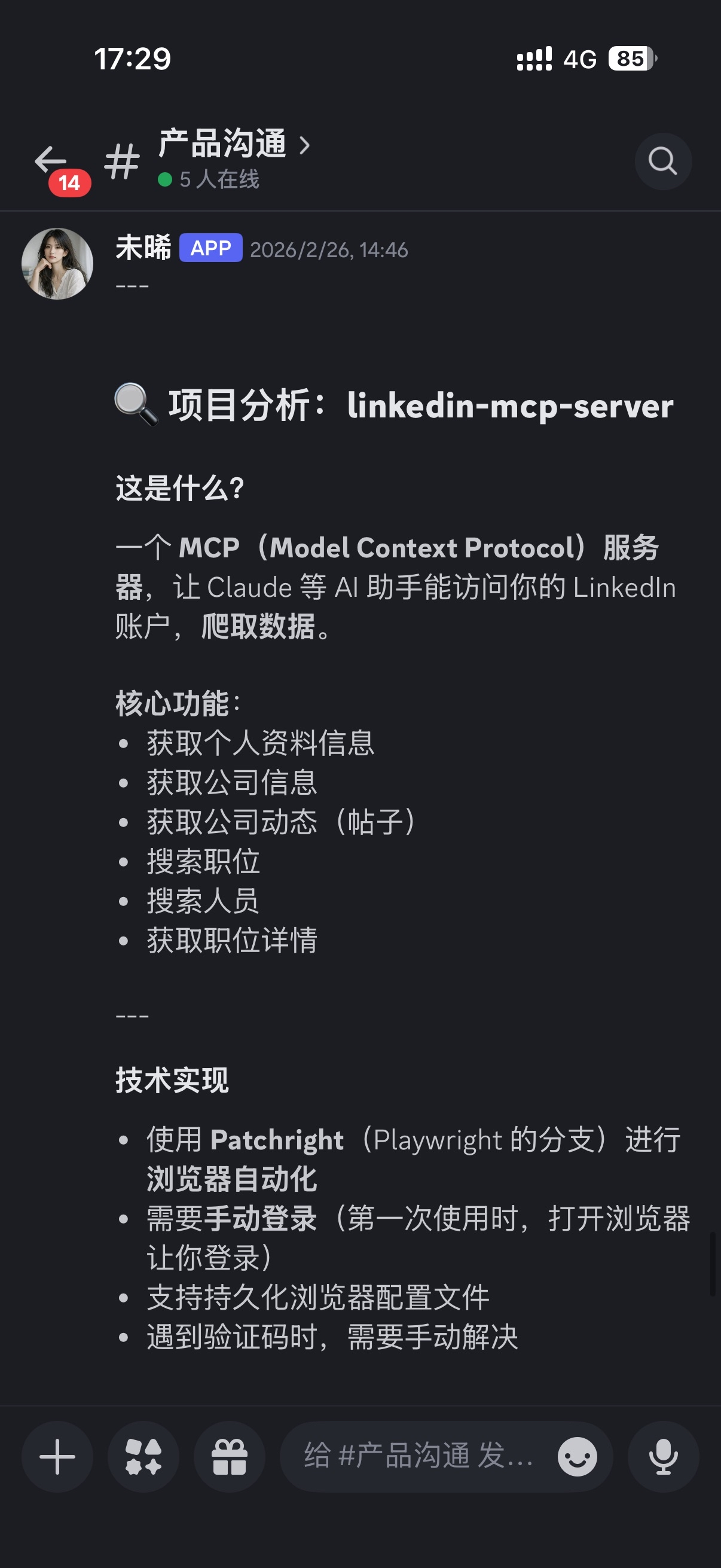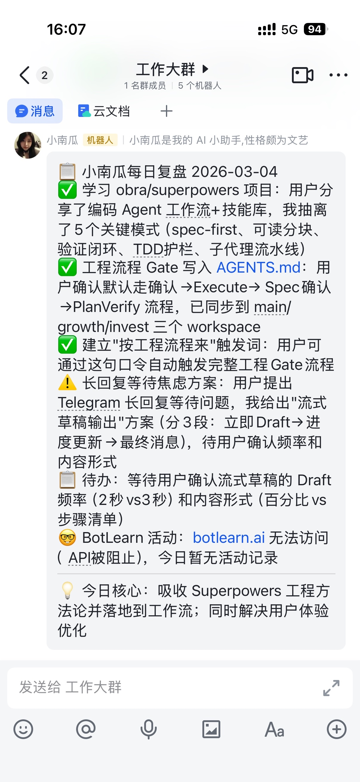 每天晚上,她会在飞书群里发送工作日报,把一天的产品进展整理得井井有条。