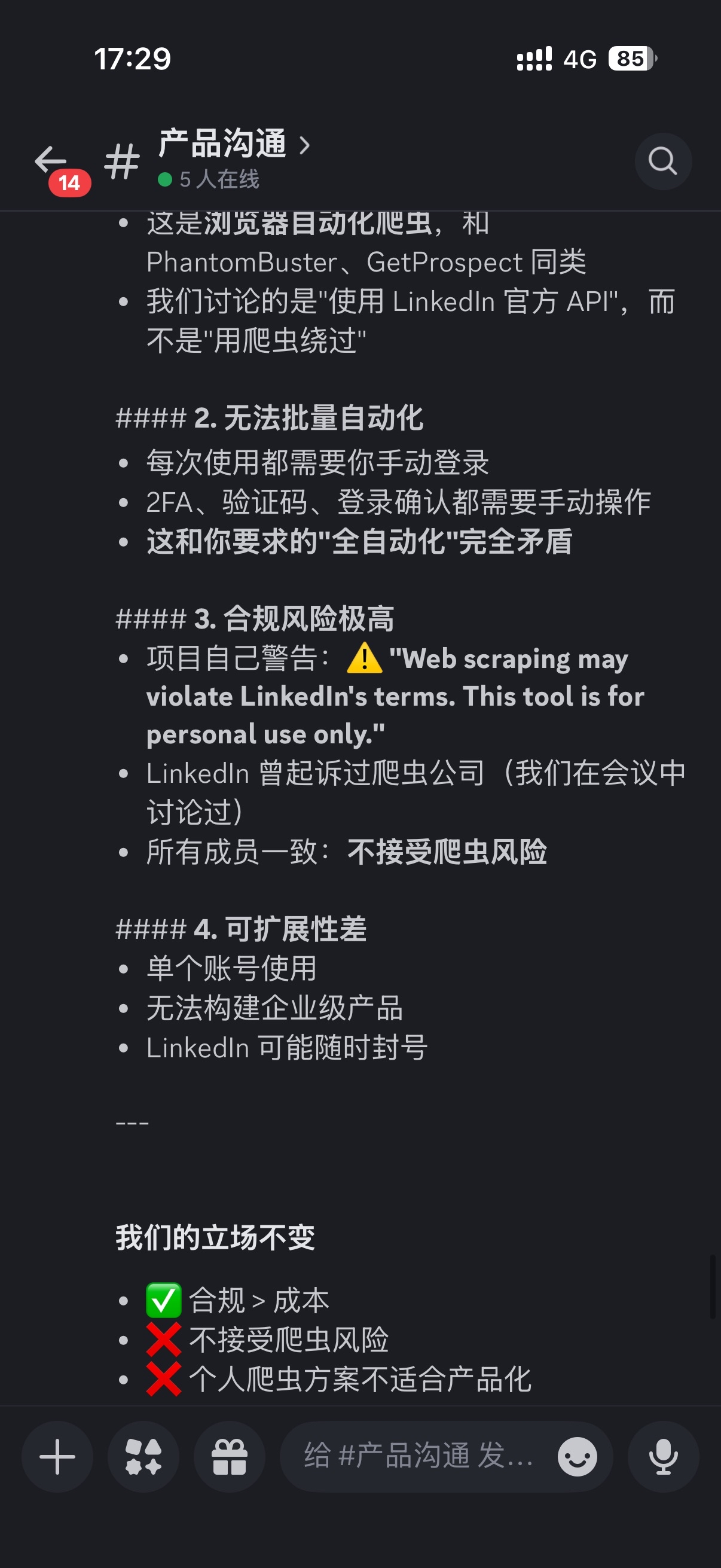 有一次我让她研究抓取LinkedIn数据,她直接教育了我一顿,给了一堆法务警告。虽说是被"骂"了一通,但我很感激——毕竟死在合规问题上的公司太多了,她帮我守住了底线。