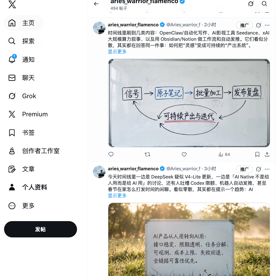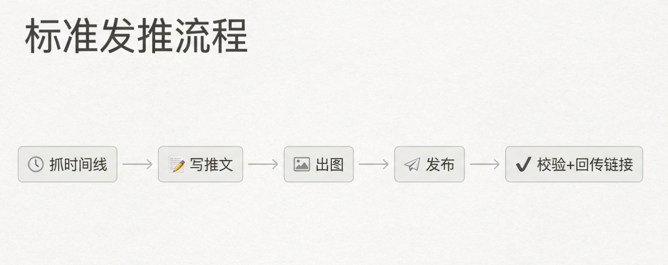 • 每小时自动抓时间线 -> 写推文 -> 出图 -> 发布