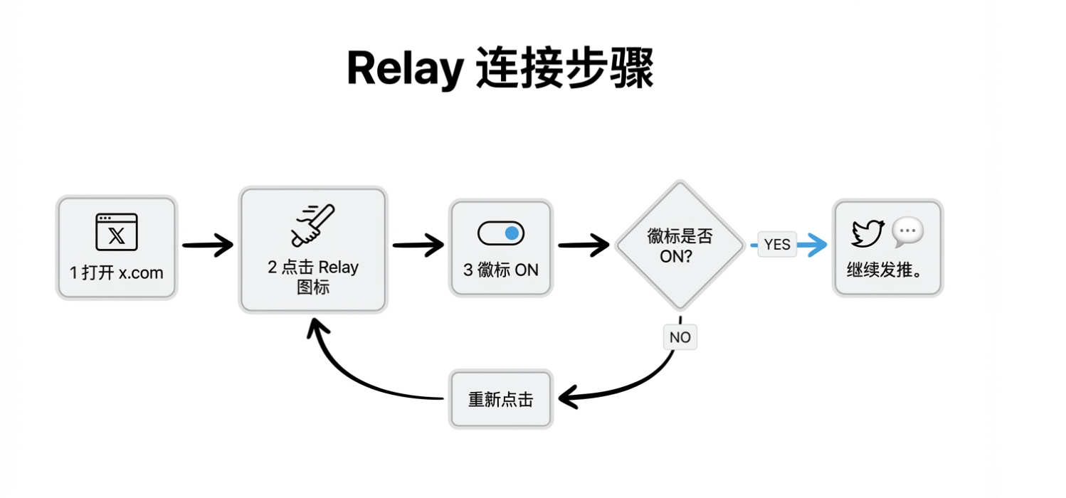 • 打开 x.com -> 点 Relay -> 徽标 ON