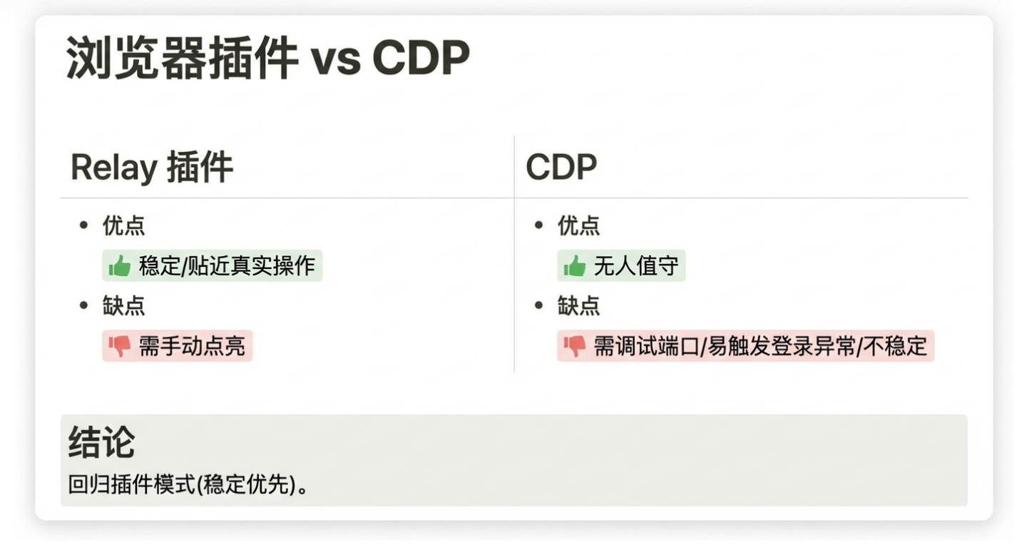 自动化最难的不是写脚本,而是把流程变成稳定习惯。 只要 Relay + Gateway 这两件事稳定,系统就能持续运行。